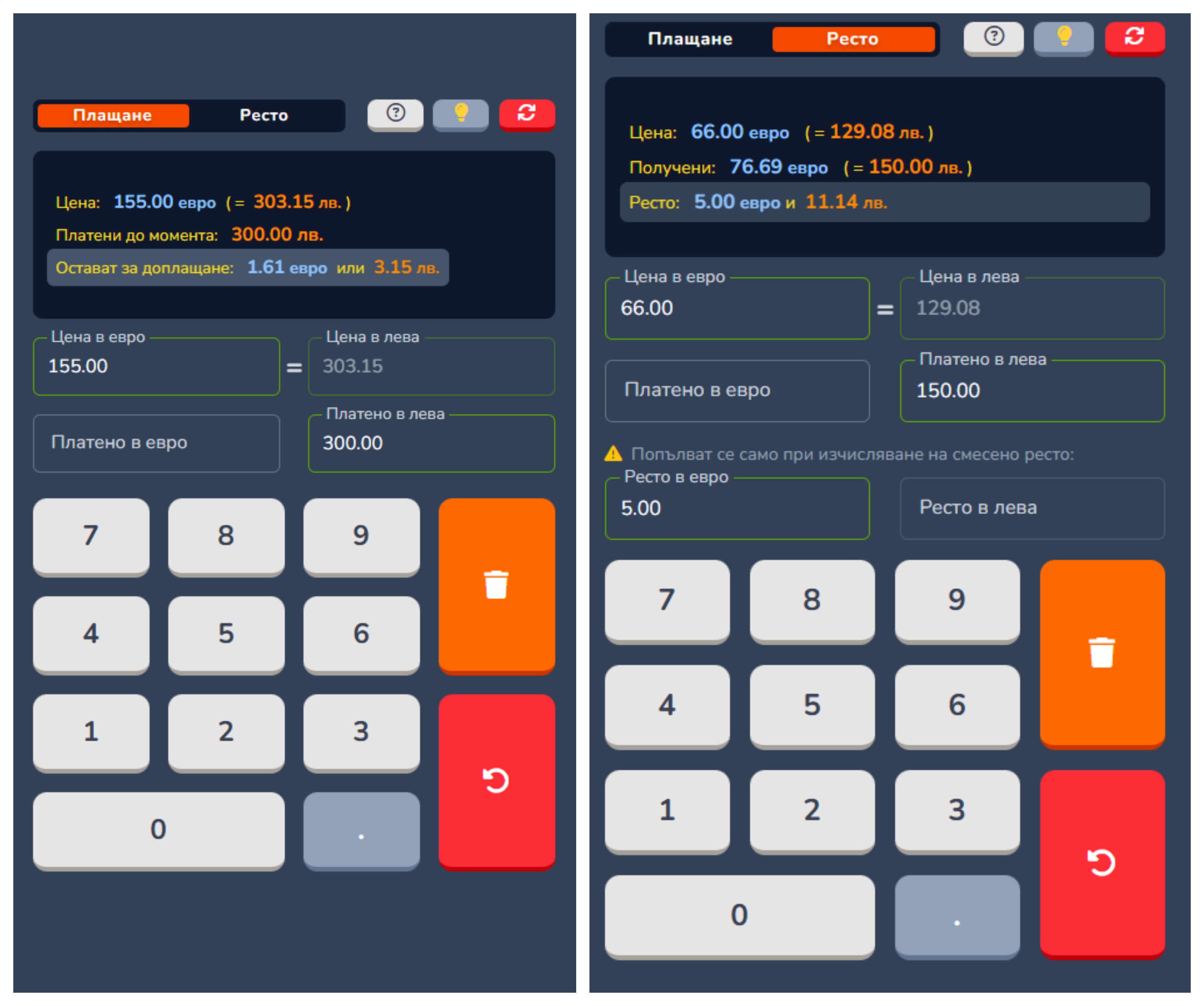 Resto26 пресмята и сумата на рестото в лв., в случай че сте магазинер и нямате наличност в евро, с цел да върнете съответната сума на потребителите.