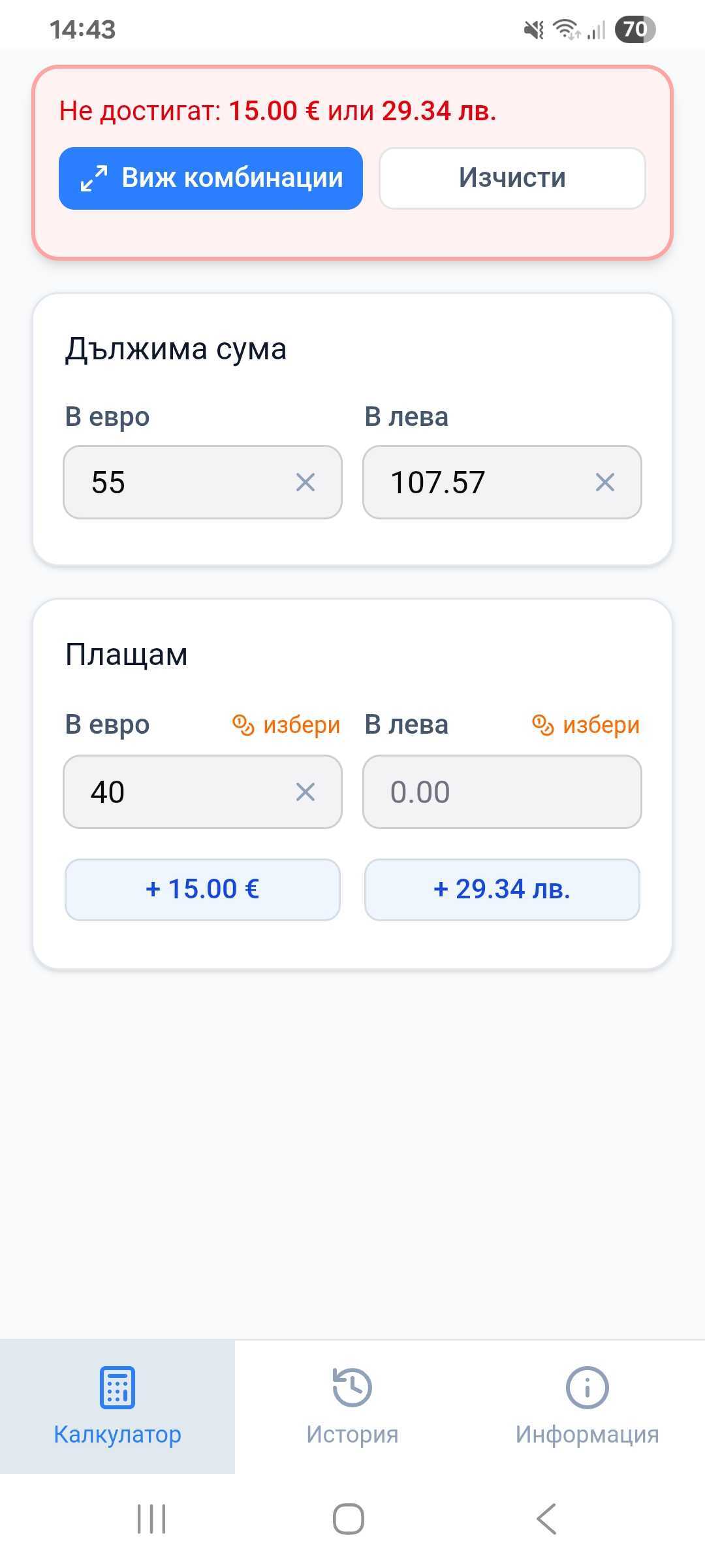 В първия вид можете да въведете цената в евро, която автоматизирано ще се преобразува и в левова равноценност. Ако клиентът е платил част от сумата в евро и са му останали единствено левове, калкулаторът ще покаже какъв брой тъкмо той би трябвало да доплати.