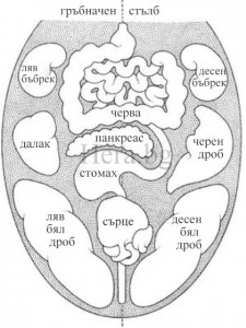 Основата на езика (корена) – демонстрира положението на бъбреците, червата и долната част на тялото;