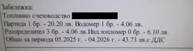 Дотук всичко е направено по закон – както написа в членовете и алинеите. Просто по този начин се прави. След това получава писмо, очевидно документите са стигнали до „ Топлофикация “, че за интервала от края на предишния отоплителен сезон, до края на идващия – през 2026 година, ще дължи 43,73 стотинки – по 3,65 на месец. В тази сума не влиза сметката за топла вода, тъй като тя е настрана. В момента жилището не се населява и това също е отразено от топлинния счетоводител.