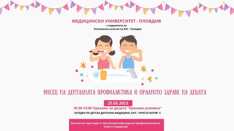 Месецът на денталната профилактика и оралното здраве на децата ще се проведе от 25 март до 25 април 2023 г. Патрон на проявата е Ректорът на МУ-Пловдив проф. доктор Мариана Мурджева.