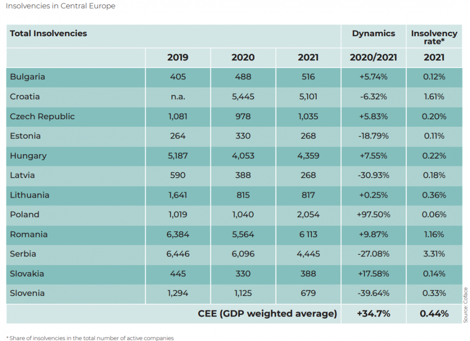 Това показва годишното проучване на несъстоятелността в Централна и Източна Европа за 2021 година на компанията за кредитно обезпечаване и ръководство на риска " Кофас ". Според разбора, понижените държавни помощи, увеличените цени на енергийните запаси и нарушените вериги за доставка са измежду факторите, които оказват и не престават да оказват отрицателно въздействие на бизнеса.