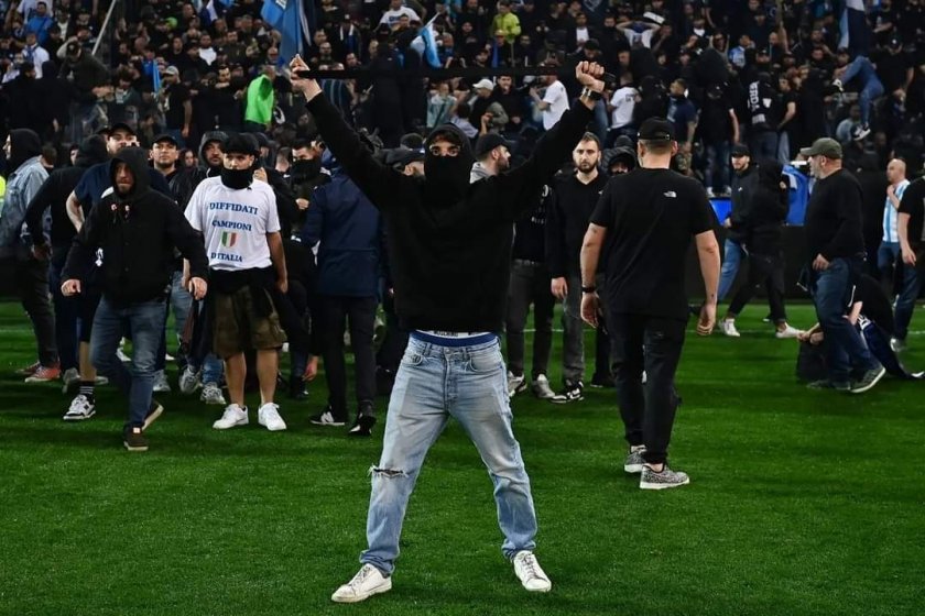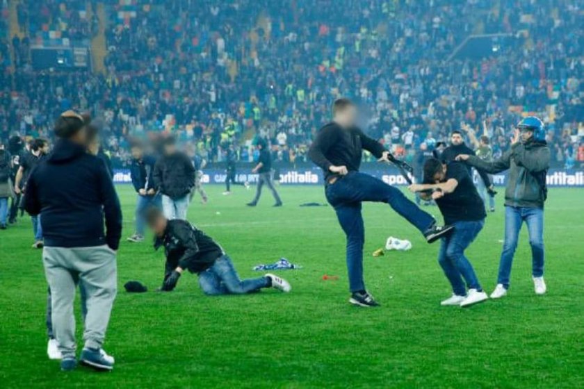 Фенове на Удинезе и Наполи си спретнаха здрав бой на терена на " Дачия сцена ". Снощи Партенопеите узакониха третото си Скудето, а повече от 10 000 тифози ги поддържаха от трибуните.