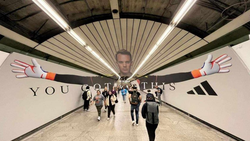 38-годишният, роден в Гелзенкирхен пазач, който дълги години пази достойнството на Байерн, лъсна в метрото в града по случай европейското състезание, което се организира в Германия. Той е разперил ръце и е " заключил " вратата си - както го прави нормално и на терена.