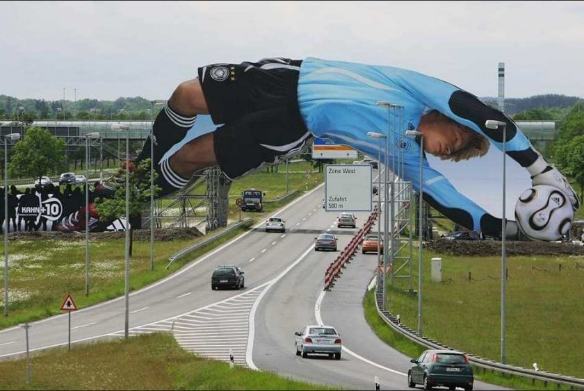 Изображението кореспондира с плонжирането на Оливер Кан над автомагистралата, което датира от 2006 година, когато Германия беше хазаин на Световната купа.
