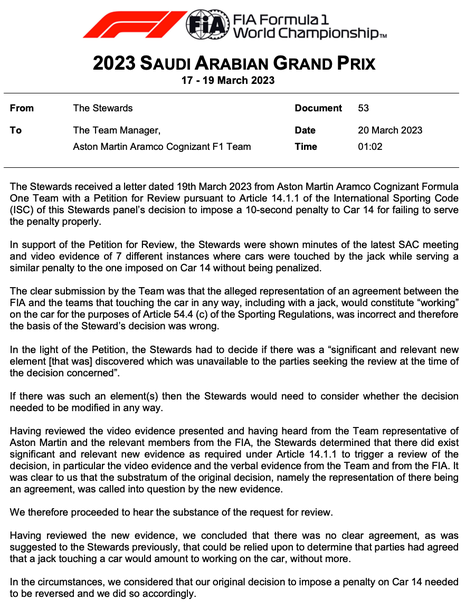 Освен това от Астън Мартин сложиха под подозрение и мнението, че тимовете са се били разбрали, че докосването за предния или задния крик ще се брои за „ работа по колата “. Оказа се, че стюардите нямат формален документ, с който да потвърдят това и предвид на горепосочените данни те нямаха различен избор, с изключение на да трансформират своето решение.