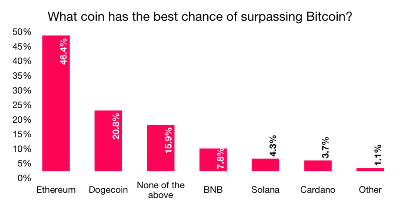 Проучване, извършено от CryptoVantage измежду 1,000 северноамерикански вложители, които са вложили в криптовалути през последните пет години сочи, че 46.4% от интервюираните считат, че ETH евентуално може да надмине Биткойн.