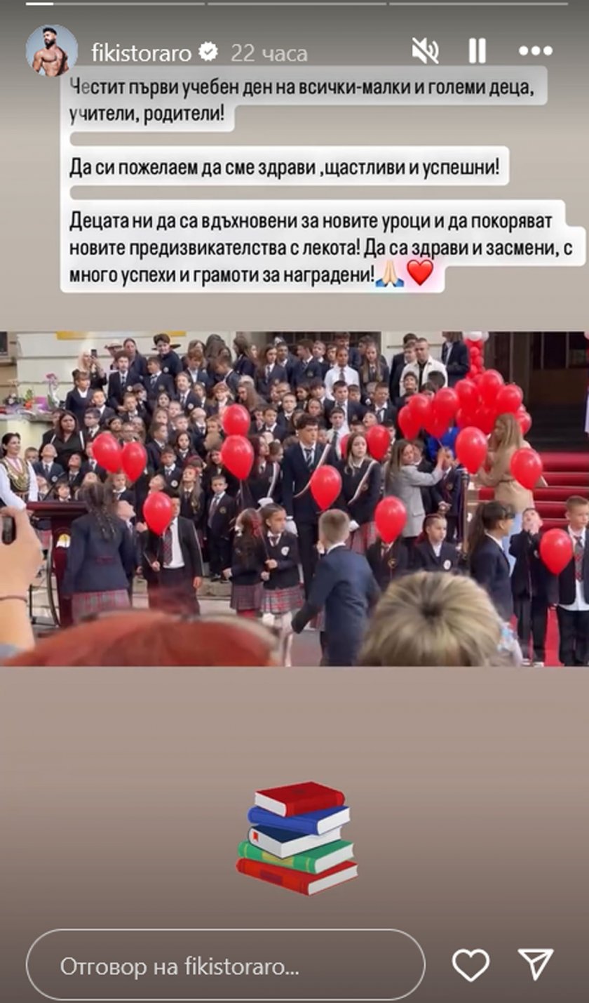 „ На добър час, благо дете! Пожелавам ти първият клас да бъда година на другарства, игри, открития и щастливи моменти, които да запомниш с усмивка за цялостен живот! “ – написа щастливият баща.