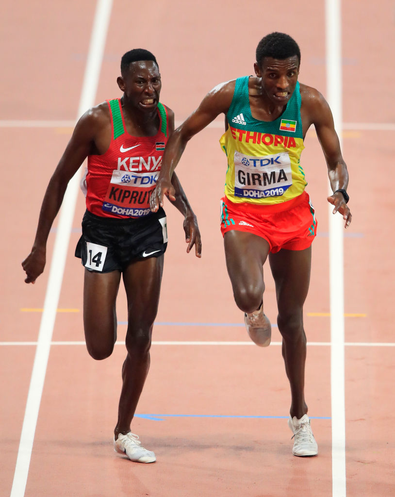 Етиопецът Ламеча Гирма се виждаше като победител метри преди финала, само че в последна сметка остана на 1 стотна от златото, откакто финишира втори с нов народен връх на страната си от 8:01.36 минути.