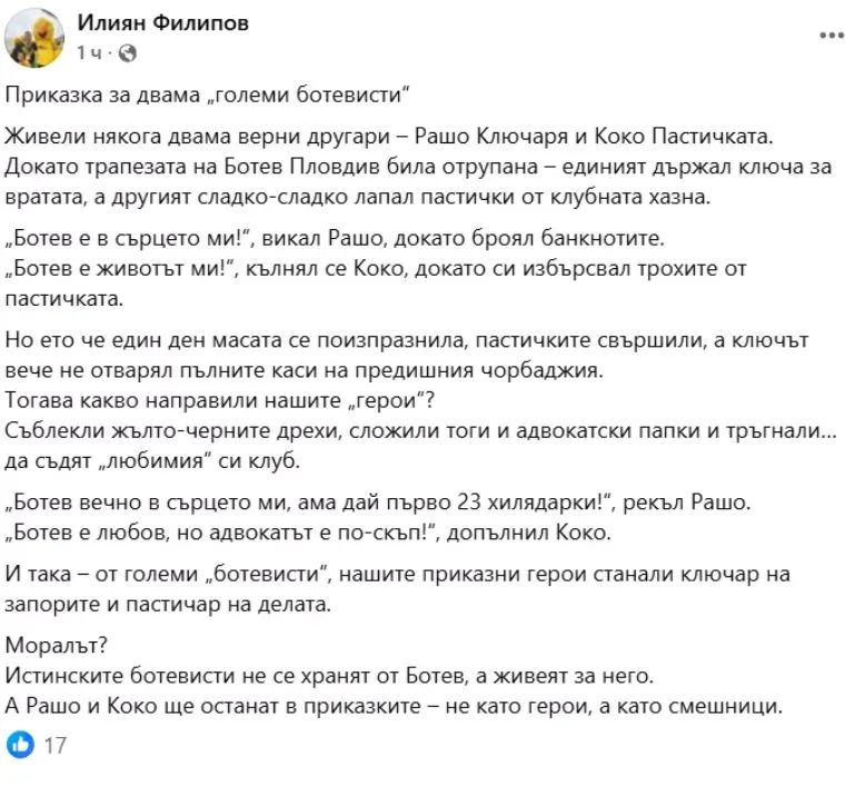 В поста си Филипов обаче не загатва и дума за тях. Вместо това той пуска „ Приказка за двама „ Големи ботевисти “, пишейки Рашо Ключаря и Коко Пастичката(б.а. визирайки Рашко Стоянов и Константин Ганев). Макар и надалеч от басните на Езоп, притежателят на ПИМК са пробва да осмива двамата заради липса на морал и защото не „ живеели за Ботев, а живеели от него “.