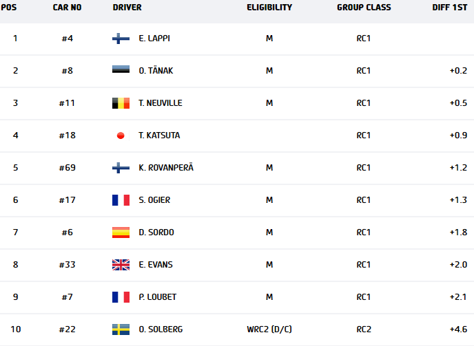 Най-бавен от водачите в Rally1 класа беше Пиер-Луи Лубе от екипа на М-Спорт. Младият французин изостана на 2.1 секунди от спечелилия в стадия Лапи.
