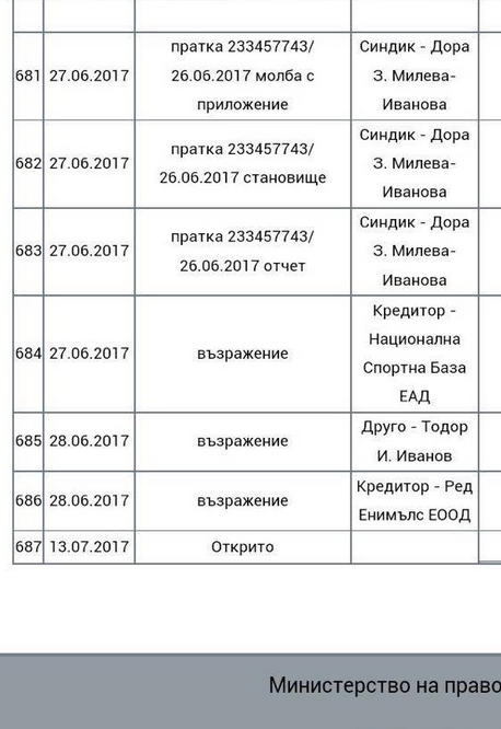 Възражението е импортирано през вчерашния ден, демонстрира информация в уеб страницата на Министерство на правораздаването. Освен спечелилия в търга, несъгласие е подал и лицето Тодор Иванов. Припомняме, че Софийски градски съд свика съвещание на 13 юли, когато ще се преглеждат възраженията за банкрутиралия най-титулуван футболен клуб в България.