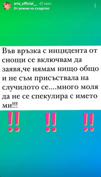 " Във връзка с случая от нощес се включвам да заявя, че нямам нищо общо и не съм участвала на случилото се... доста апелирам да се не спекулира с името ми!!! ", написа певицата.