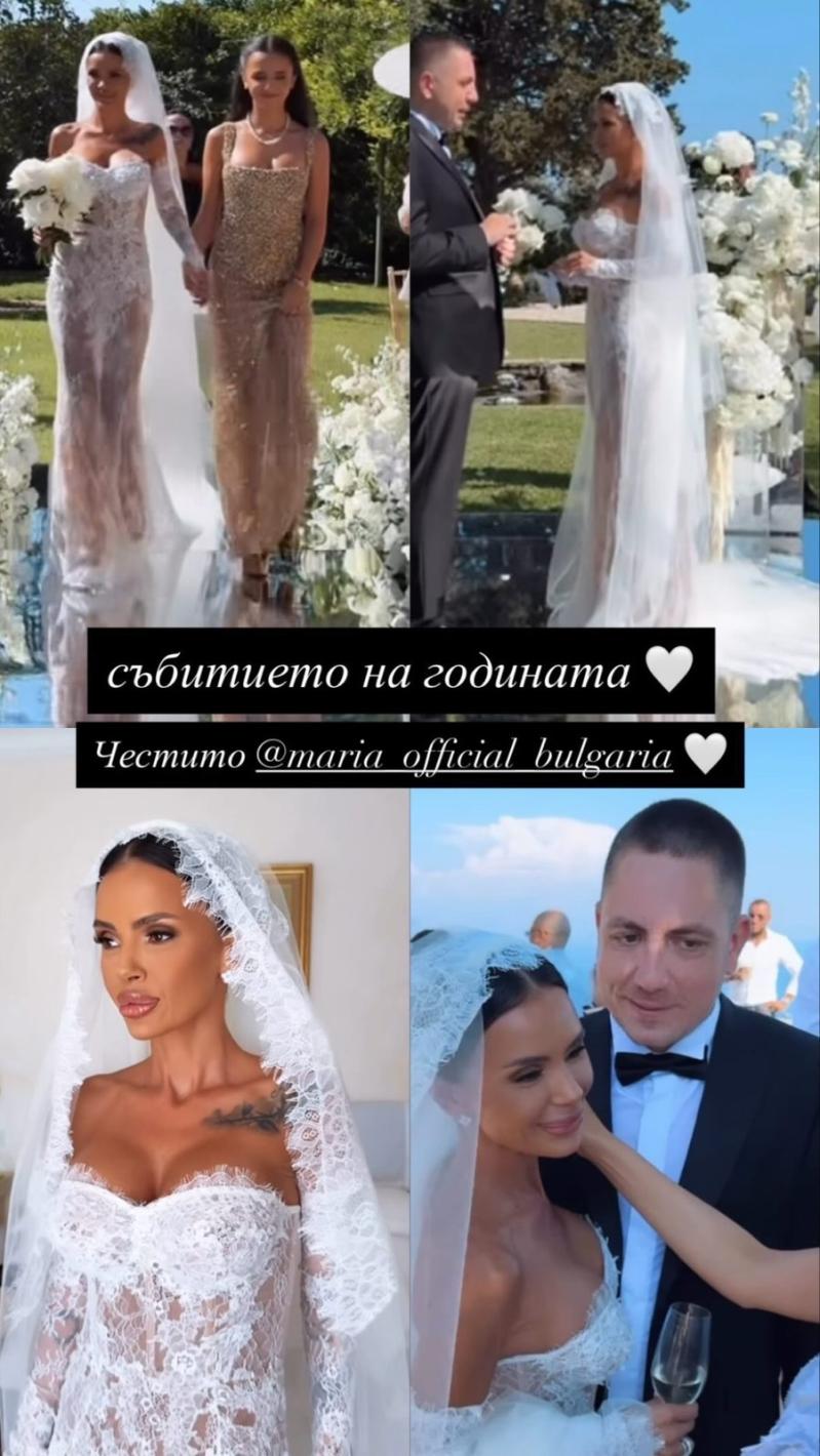 До олтара, облечена в елегантна бяла, дантелена рокля, дело на български дизайнер, Мария беше съпроводена от щерка си Марая. Видеа от събитието демонстрират забележимото неспокойствие на младоженеца, който нетърпеливо я чакаше на огледалния подиум.