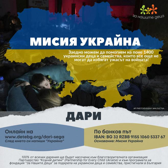 Фондация „ За Нашите Деца “ започва дарителска акция „ Мисия Украйна “ за спасяването на 1400 украински деца и фамилии.