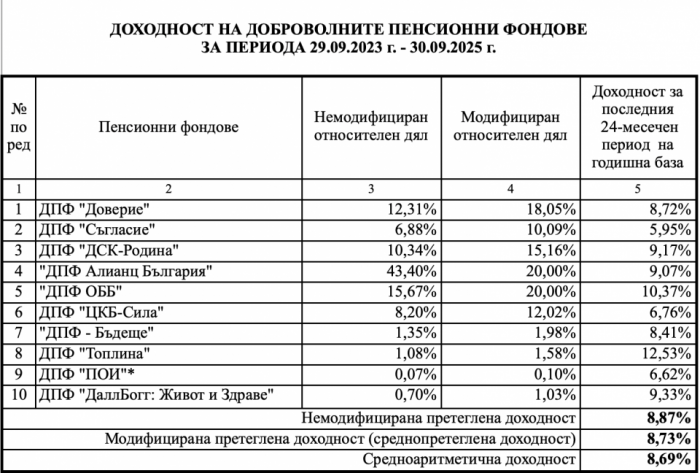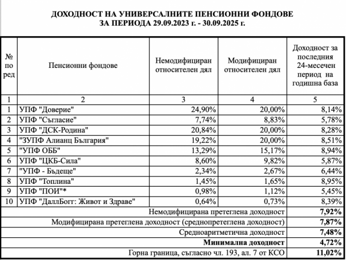 Фондовете за в допълнение пенсионно обезпечаване регистрират доста добра рентабилност на фона на нулевите лихви за банковите депозити. Шест от десетте универсални фонда са съумели да реализират над 8%, а при доброволните има дори 10-12% рентабилност. Това демонстрират данни на Комисията за финансов контрол за интервала 29 септември 2023 - 30 септември 2025 г, написа Сега.