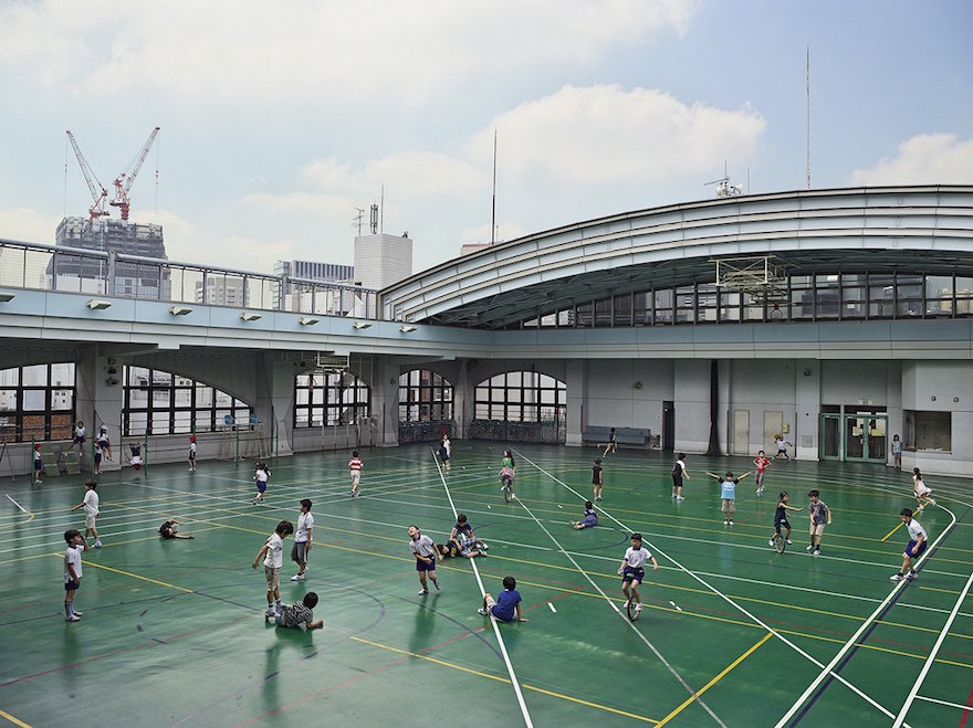 ТОКИО, ЯПОНИЯ: Заради високата цена на земята в Токио, детските площадки са издигнати на покрива на учебното заведение. На децата е разрешено да играят единствено с меки топки, при положение, че топката падне върху някой минувач на улицата. Площадката има преносим покрив, от който се чува музика, когато се затваря. На всеки два дни децата чистят учебното заведение. Директорът счита, че е извънредно значимо дребните да се научат да почистват след себе си.