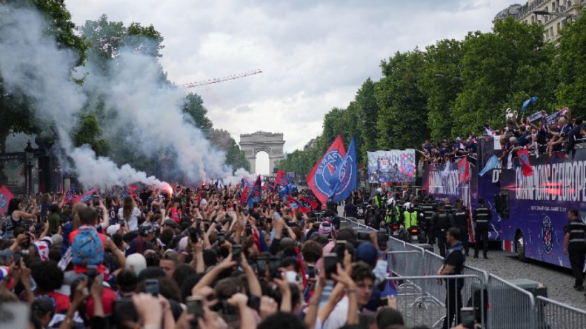 Фойерверки, песни, флагове и фотоси с мобилните телефони - играчите на Пари Сен Жермен направиха церемониал на успеха по бул. " Шанз Елизе " в Париж, съобщи Агенция Франс Прес.