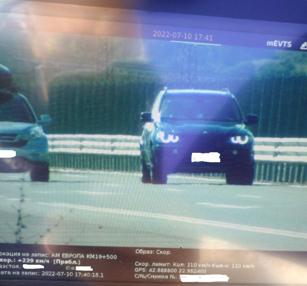 Министерство на вътрешните работи С мобилно техническо средство, на автомагистрала „ Европа “, е сниман лек автомобил с задгранична регистрация, движещ се с 229 км/ч при оптимално позволена 110 км/ч. За сходно превишение плануванаъа по закон глоба е в размер на 1200 лв..