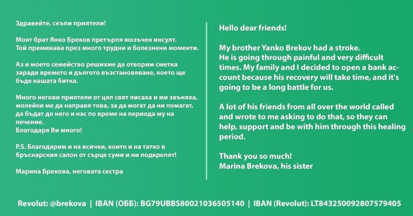 Фронтменът на " The Pomorians " Янко Бреков е получил инсулт и е в доста тежко положение. Това заяви неговата сестра Марина Брекова, която прикани другари и познати да отделят средства за възобновяване на рокаджията.