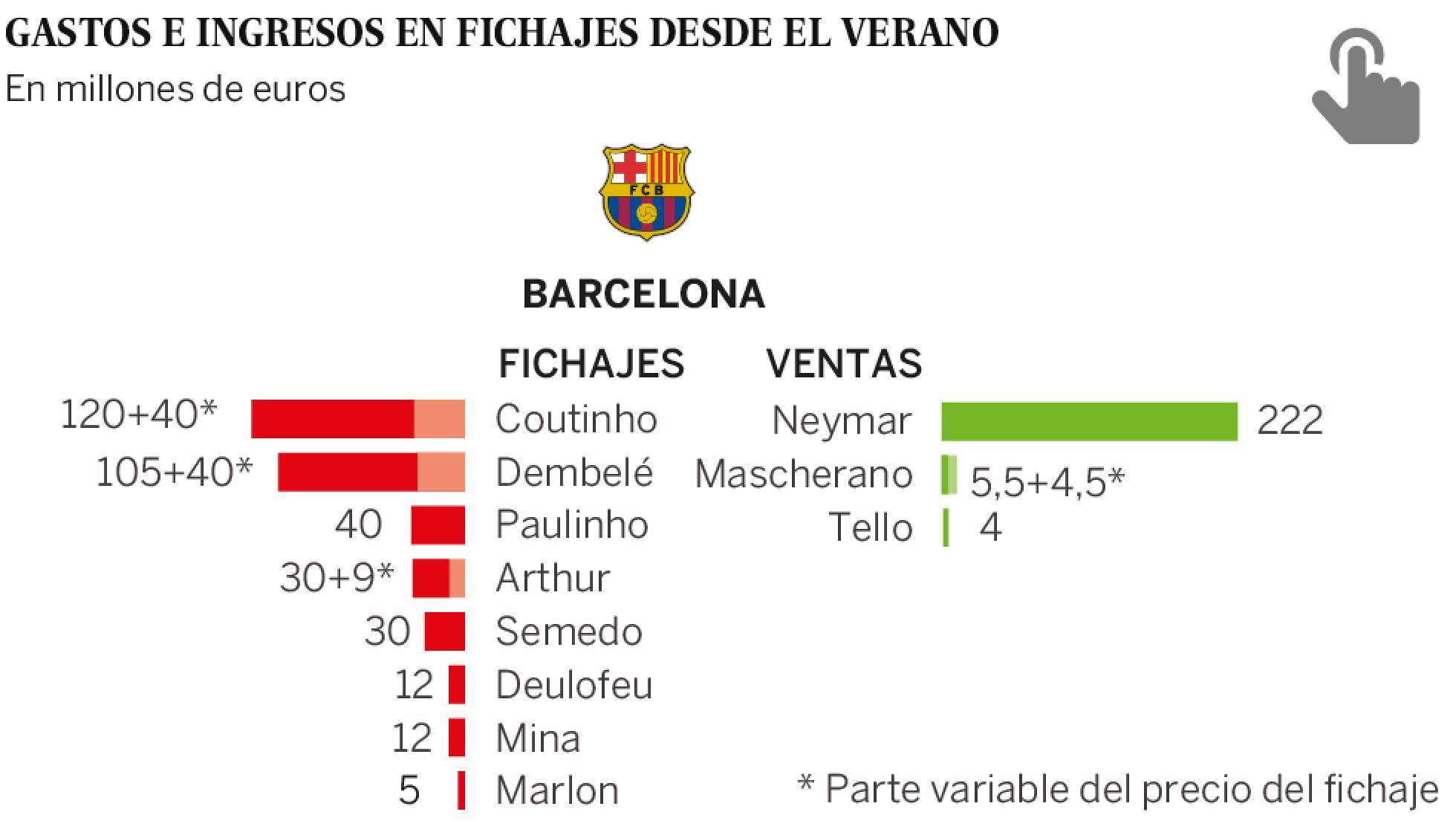 Президентът Бартомеу не изчака и секунда да запълни отворената от Неймар празнота в състава, с цел да не рискува Меси да изгуби самообладание, и дадените за нови попълнения пари към този момент надвишават постъпилите от Пари Сен Жермен 222 млн. евро. Салдото към този момент е негативно (-122,5 млн. евро твърдо, -207 млн. с бонусите), а перото „ заплати” в клубния бюджет към този момент надвишава 80% от общия оборот. Тази цифра е изключително тревожна за това управление, което от самото си идване на власт пропагандираше финансова дисциплинираност, откакто обвиняваше в разсипничество тогавашния президент Жоан Лапорта. Ключът към триумфа за управата е да си завоюва време с победи на терена, с цел да продава добре комерсиалната марка „ Барса”. А тимът на Меси работи доста добре под управлението на новия треньор Ернесто Валверде.