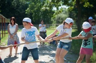 Напред към водните бомби! Цвети, Вальо и Ели оказват помощ с слагането на шапки по всички глави и повеждат народа към задния двор.