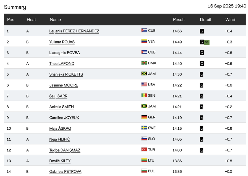 С квалификационната норма от 14.35 м се оправиха международната шампионка в зала от тази зима Леянис Перез Ернандес (14.66 м), завърналата се след травма международна рекордьорка Юлимар Рохас (14.49 м), втората от планетарния конгрес под покрив тази зима Лядагмис Повеа (14.44 м) и олимпийската шампионка Тиа Лафонд (14.40).