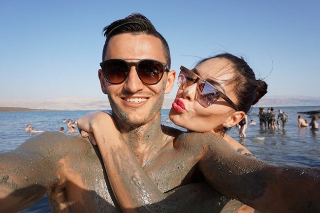 Гадже намаза наш национал с черна тиня на брега на Мъртво море. Георги Костадинов и красивата му другарка Радост съчетаха потребното с приятното и пробваха лечебни процедури в Израел.