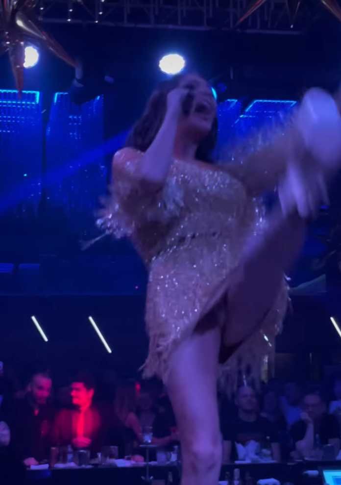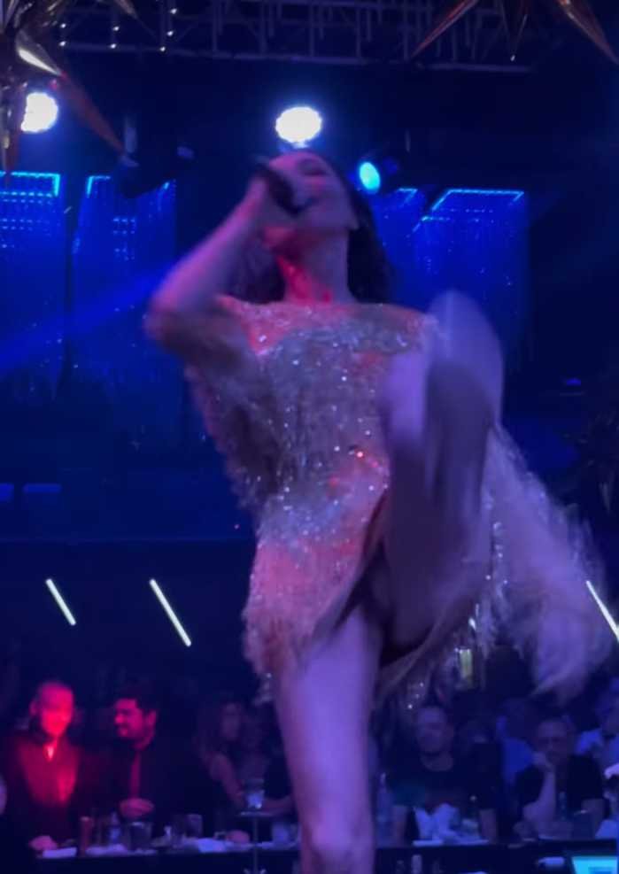 Изпълнителката, която обича мощно да предизвика феновете си, беше с къса рокля, като не спираше да си подвига краката, а почитателите пред нея се любуваха на интимните й елементи, които май бяха без долни дрехи, както си проличава от фрагментите. Смядовката постоянно подвига изявите си в нощните заведения на ново равнище, а почитателите й от мъжки пол изпадат в възторг, още повече като си пийнат и шмръкнат.