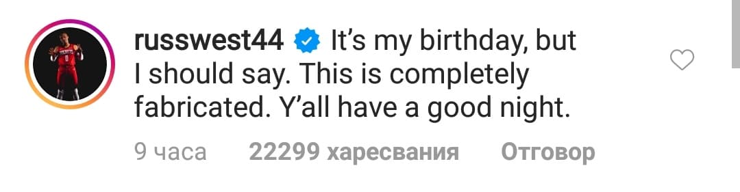 " Днес е рожденият ми ден (б.р - вчера), само че би трябвало да го кажа. Това е цялостна небивалица. Приятна вечер ", написа Уестбрук.