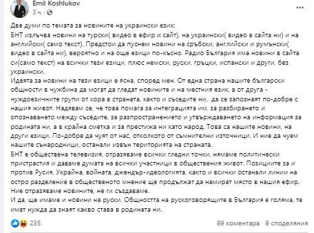 Генералният шеф на Българска национална телевизия Емил Кошлуков даде обещание националната телевизия да пусне вести и на съветски език, откакто в понеделник пусна вести на украински.