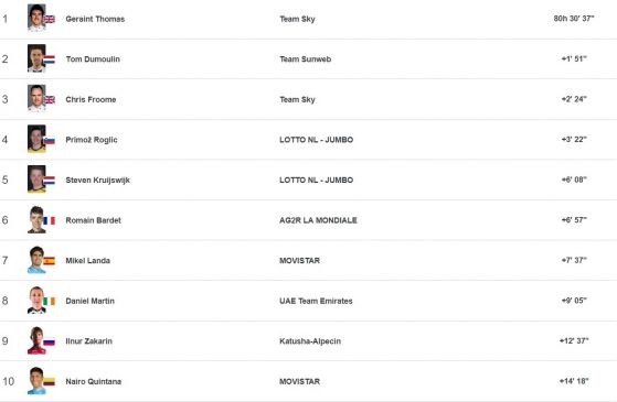 В генералното класиране Томас води още от 11-ия стадий и усилваше преднината си методично, с цел да си обезпечи крайната победа. Втори е Дюмулен с изоставене от 1:51 минути, а трети с 2:24 минути е Фрум, като е несъмнено, че това ще е и крайното класиране в " Тур дьо Франс 2018 ".