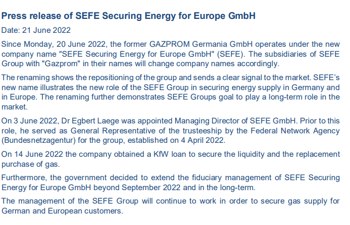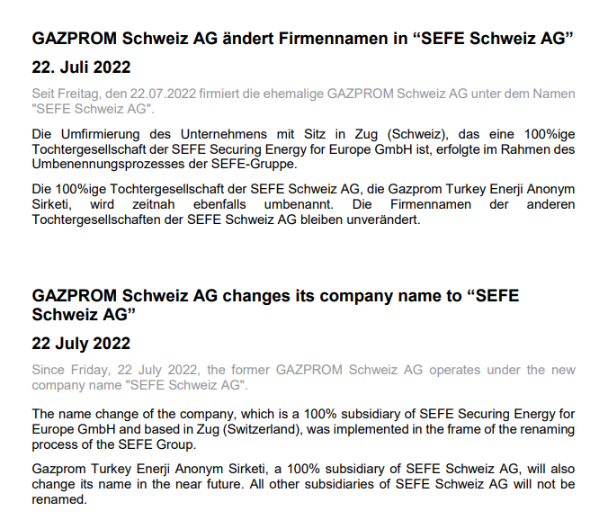 От този миг нататък до придобиването 100% на активите от SEFE Group, която оперира и със 100% от активите на " Газпром Суис ", съветската " Газпром " няма никакво присъединяване в покупко-продажбите за синьо гориво.