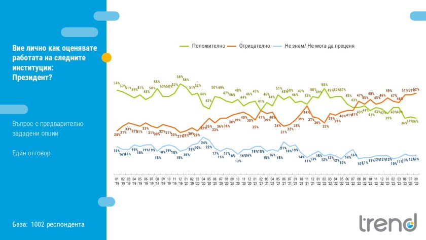 Проучването на социологическа организация " Тренд " е по поръчка на вестник " 24 часа " и е отдадено на настройките на българите по отношение на главните институции и партиите. Изследването е осъществено в интервала сред 2 и 8 септември 2023 година посредством директно полустандартизирано изявление " лице в лице " с таблет измежду 1002 души на възраст 18+.