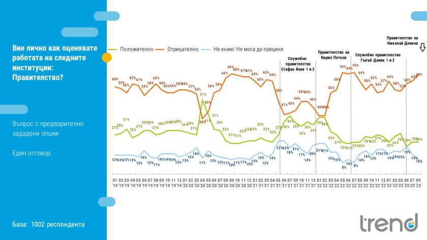 22% показват позитивна оценка към работата на кабинета " Денков ". Отрицателната оценка се покачва в трето следващо проучване, като през септември доближава 68%. Най-голяма поддръжка държавното управление среща измежду последователите на " Продължаваме промяната-Демократична България " - над три четвърти от тях поддържат кабинета.