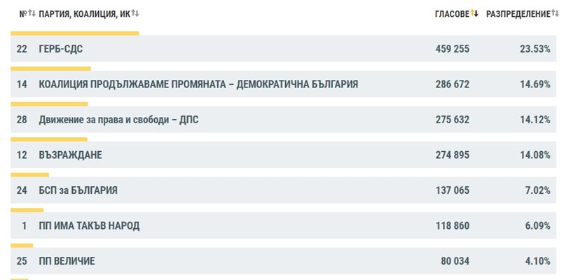 При евровота са обработени 97.03% СИК протоколи в РИК. ГЕРБ е с 23.53%, а ПП-ДБ са с 14.69%, следвани от ДПС с 14.12%. " Възраждане " имат 14.08%, БСП имат 7.02%, до момента в който Има Такъв Народ са с 6.09%. " Величие " имат 4.10%.