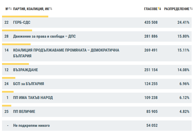 За Българска социалистическа партия са дали своят вот 6.96%, Има Такъв Народ са спечелили доверието на 6.12% от гласоподавателите. " Величие ", които бяха с съвсем 5%, към този момент 4.82%, само че затвърждават влизане в Народното събрание.