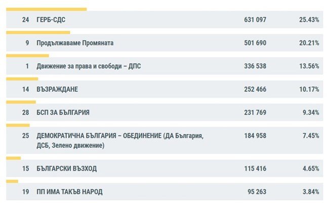 ГЕРБ-СДС печели предварителните парламентарни избори с 25,43% от вота в страната, сочат данните на ЦИК при 99,03% преброени протоколи.