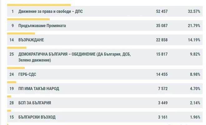 С 20,21% " Продължаваме промяната " са втори, а Движение за права и свободи вземат 13,56% и са трети. " Възраждане " заемат четвъртата позиция с 10,17%, следвани от БПС с 9,34%. За " Демократична България " са дали своят вот 7,45%.