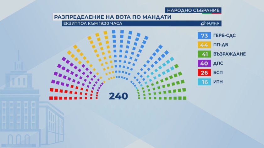 Според тези данни ГЕРБ-СДС биха разполагали с 73%, ПП-ДБ с 44, " Възраждане " - с 41. Движение за права и свободи биха имали 40 депутати, Българска социалистическа партия - 26, а " ИТН " - 16.