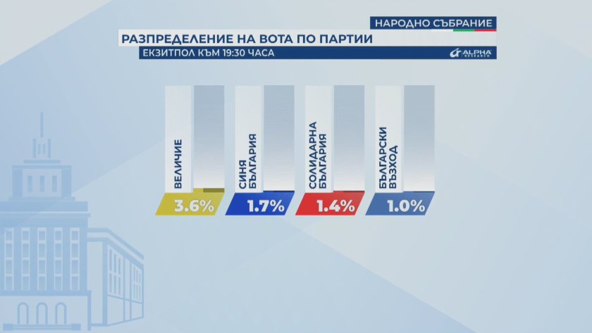 Под чертата остават " Величие " с 3,6%, " Синя България " с 1,7%, " Солидарна България " с 1,4% и " Български напредък " с 1%.
