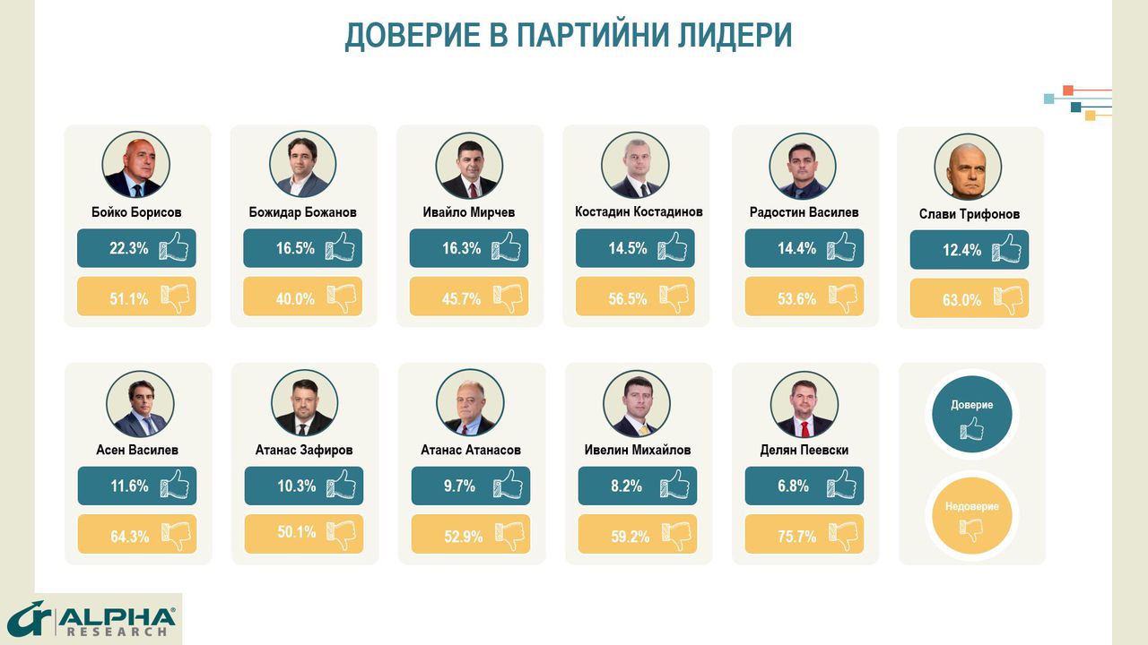 Бойко Борисов остава партийният водач с най-високо доверие (22.3%). Божидар Божанов е с 16.5%, а Ивайло Мирчев с 16.3%.
