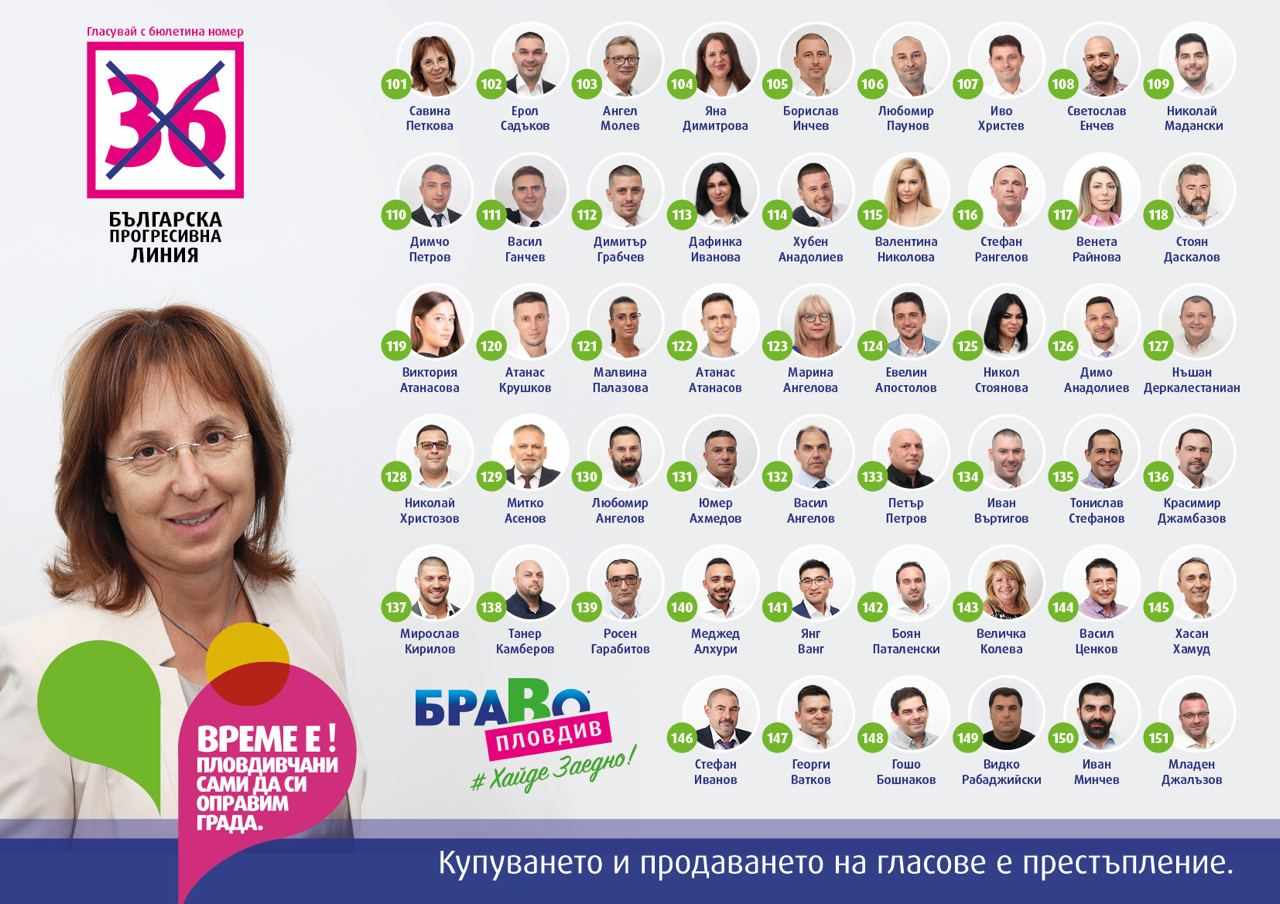 " Браво, Пловдив " е с №36 в интегралната бюлетина с регистрацията на „ Българска прогресивна линия " за кмет, областен кмет и листа за общински съветници!