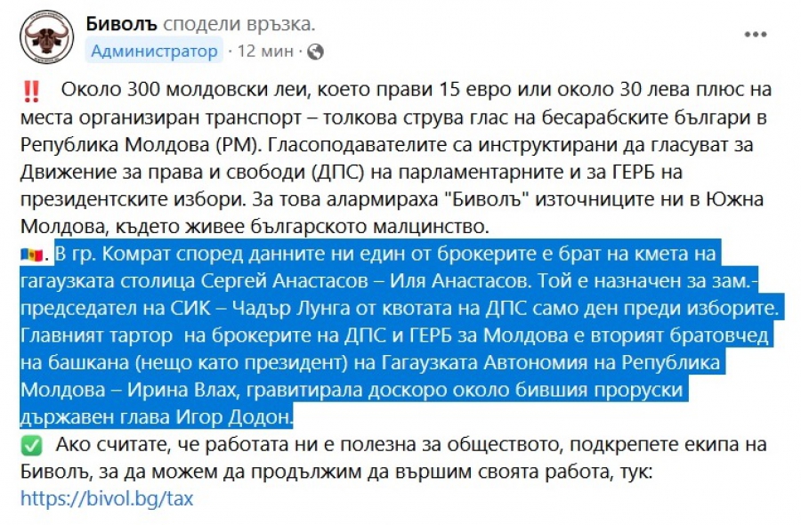 " В гр. Комрат съгласно данните ни един от брокерите е брат на кмета на гагаузката столица Сергей Анастасов – Иля Анастасов. Той е назначен за зам.-председател на СИК – Чадър Лунга от квотата на Движение за права и свободи единствено ден преди изборите. Главният главатар на брокерите на Движение за права и свободи и ГЕРБ за Молдова е вторият братовчед на башкана (нещо като президент) на Гагаузката Автономия на Република Молдова – Ирина Влах, гравитирала до неотдавна към някогашния проруски държавен глава Игор Додон ", пишат във Facebook от " Биволъ ".