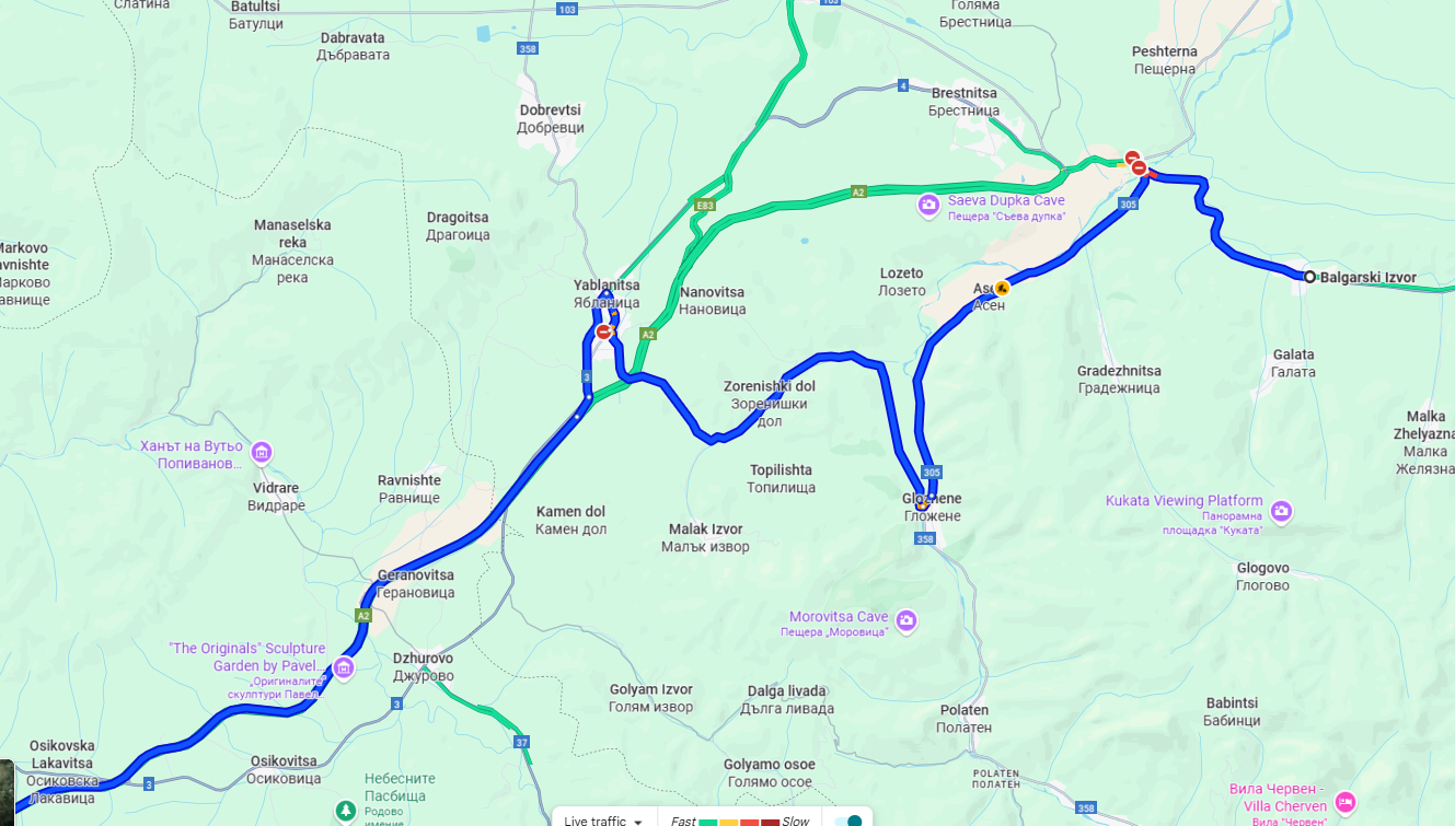 Обходният маршрут за движещите се в посока София е пътя III-305 - Асен - Гложене - Зоренишки дол - Ябланица.