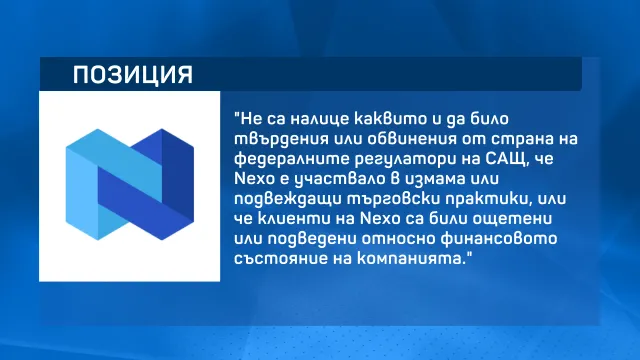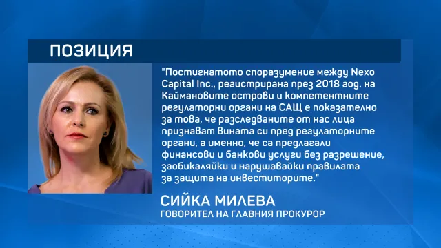 “Постигнатото съглашение сред “Нексо ” и способените регулаторни органи на Съединени американски щати е показателно за това, че разследваните от нас лица признават виновността си пред регулаторните органи, а точно, че са предложили финансови и банкови услуги без позволение, заобикаляйки и нарушавайки разпоредбите за отбрана на вложителите ”, сподели представителят на основния прокурор Сийка Милева.