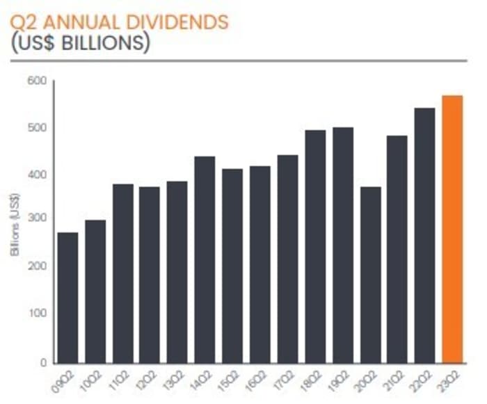 Глобалните дивиденти набъбнаха с 4,9% до рекордните 568 милиарда $ през второто тримесечие, само че темпът на напредък в Съединени американски щати се забави за шесто следващо тримесечие, откакто някои високопоставени софтуерни и финансови групи понижиха изплащанията си.В своето тримесечно изследване на 1200-те най-големи обществени компании в света по пазарна стойност основаният в Обединеното кралство фонд управител Янус Хендерсън сподели, че 88% или са нараснали дивидентите си, или са ги запазили същите през интервала.Дори при прогнозата за закъснение на световната икономическа интензивност, Янус Хендерсън поддържа упованията си изплащанията да доближат връх за цялата година от 1,64 трилиона $ през 2023 година, което се равнява на главен напредък от 5%.
