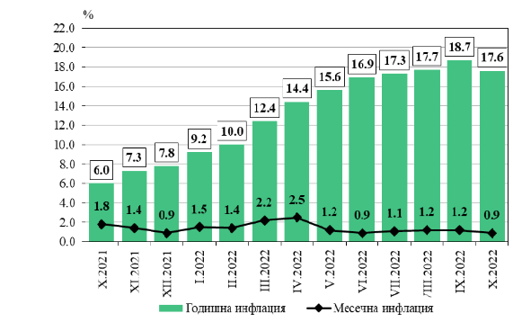 Инфлацията от началото на годината (октомври 2022 година по отношение на декември 2021 г.) е 15.0%.