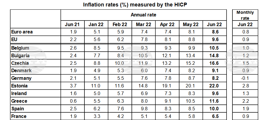 Годишната инфлация в еврозоната е била 8,6 на 100 през юни 2022 година по отношение на 8,1 на 100 през май. Година по-рано нивото е било 1,9 на 100.