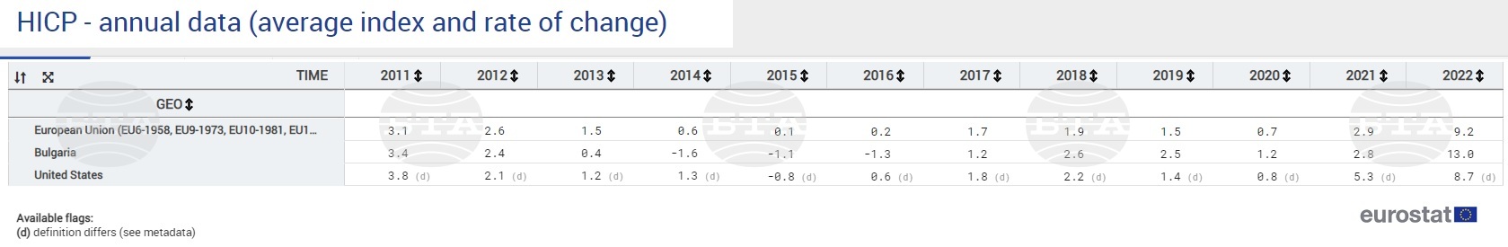 В съпоставяне с 2021 година, когато повишението на цените бе едвам 2,9 на 100, инфлацията през предходната година е повишена повече от три пъти, оповестява европейската статистическа организация Евростат.